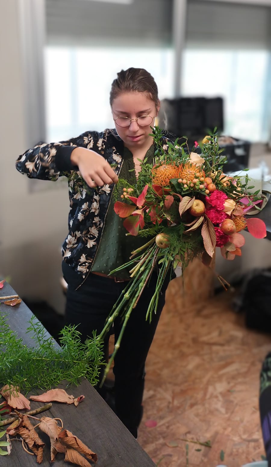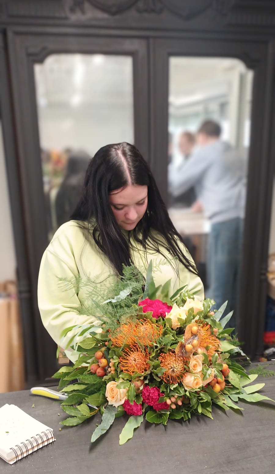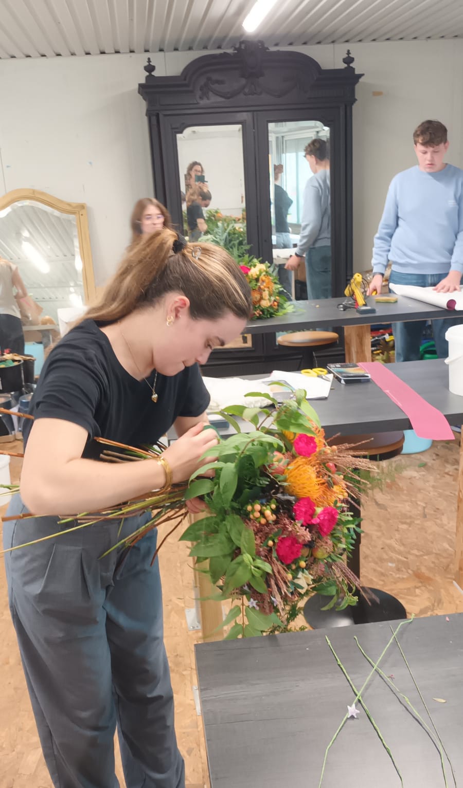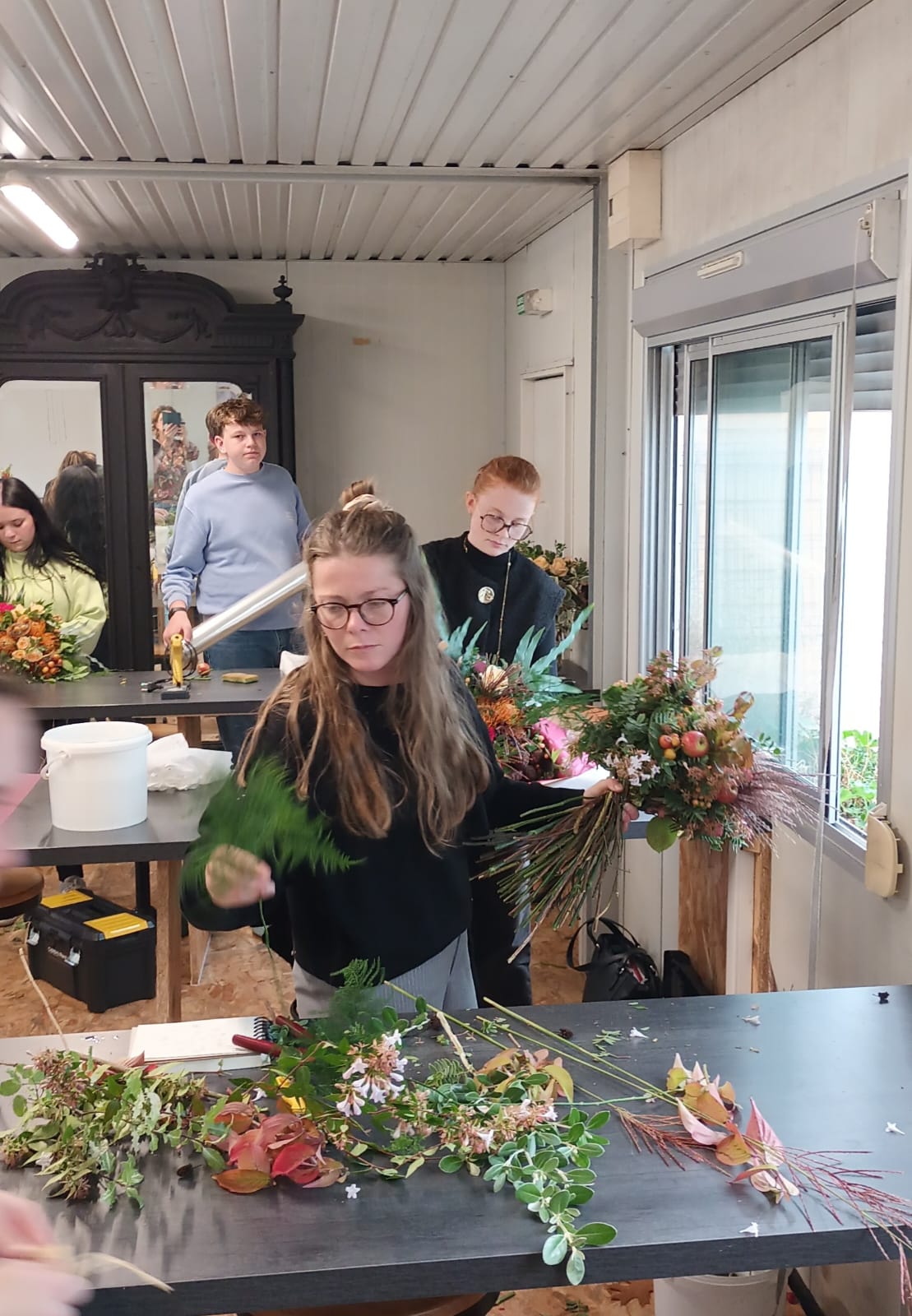 Réalisation de bouquets liés ronds de style décoratif, asymétrique par masse avec les apprentis en CAP Fleuriste 2ᵉ année et en un an.