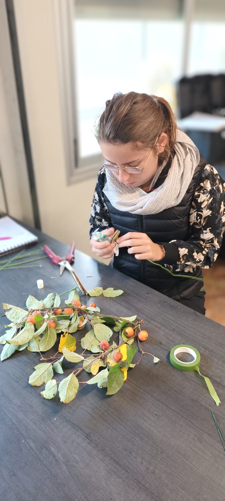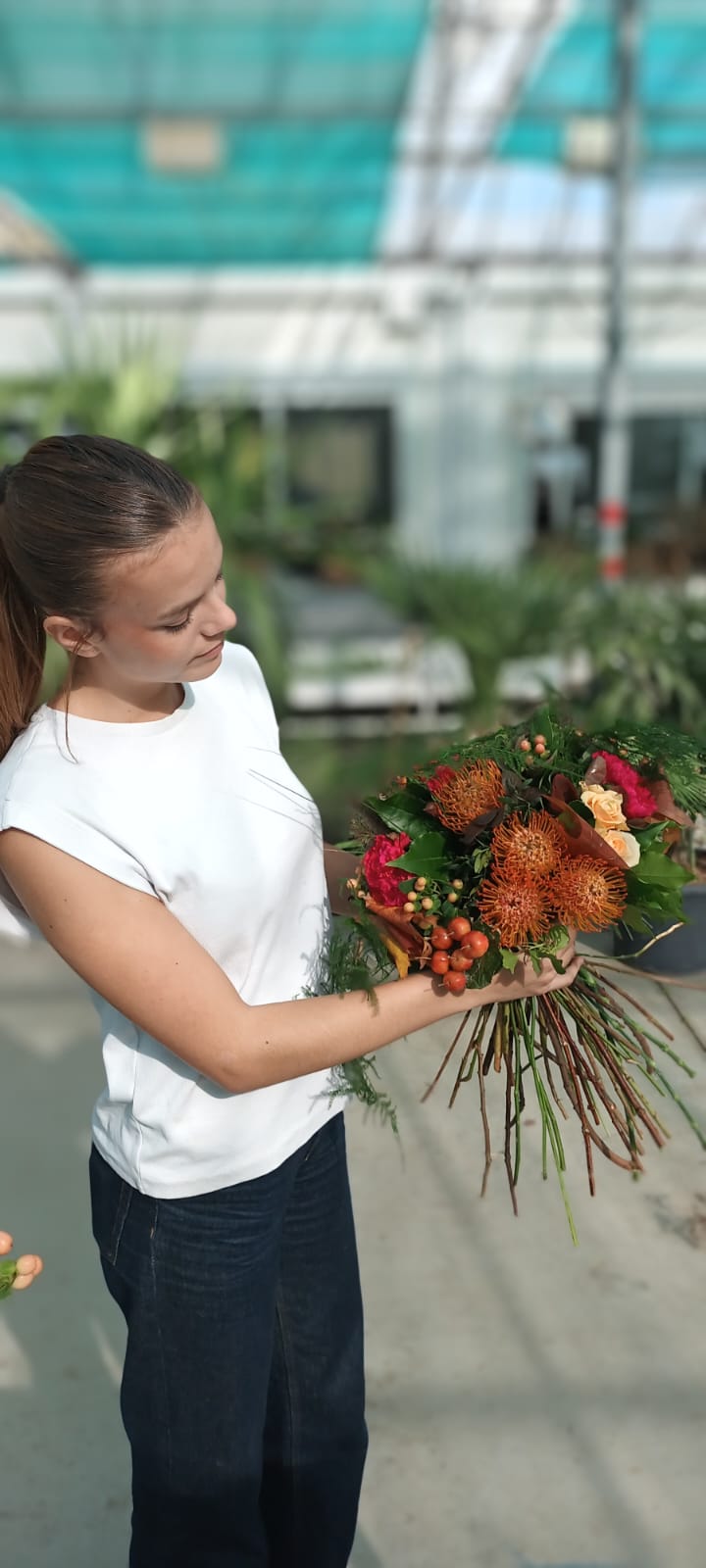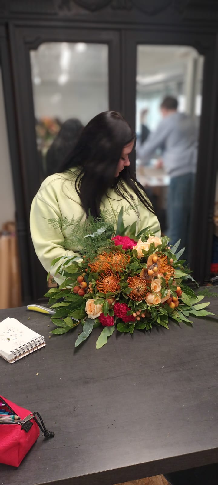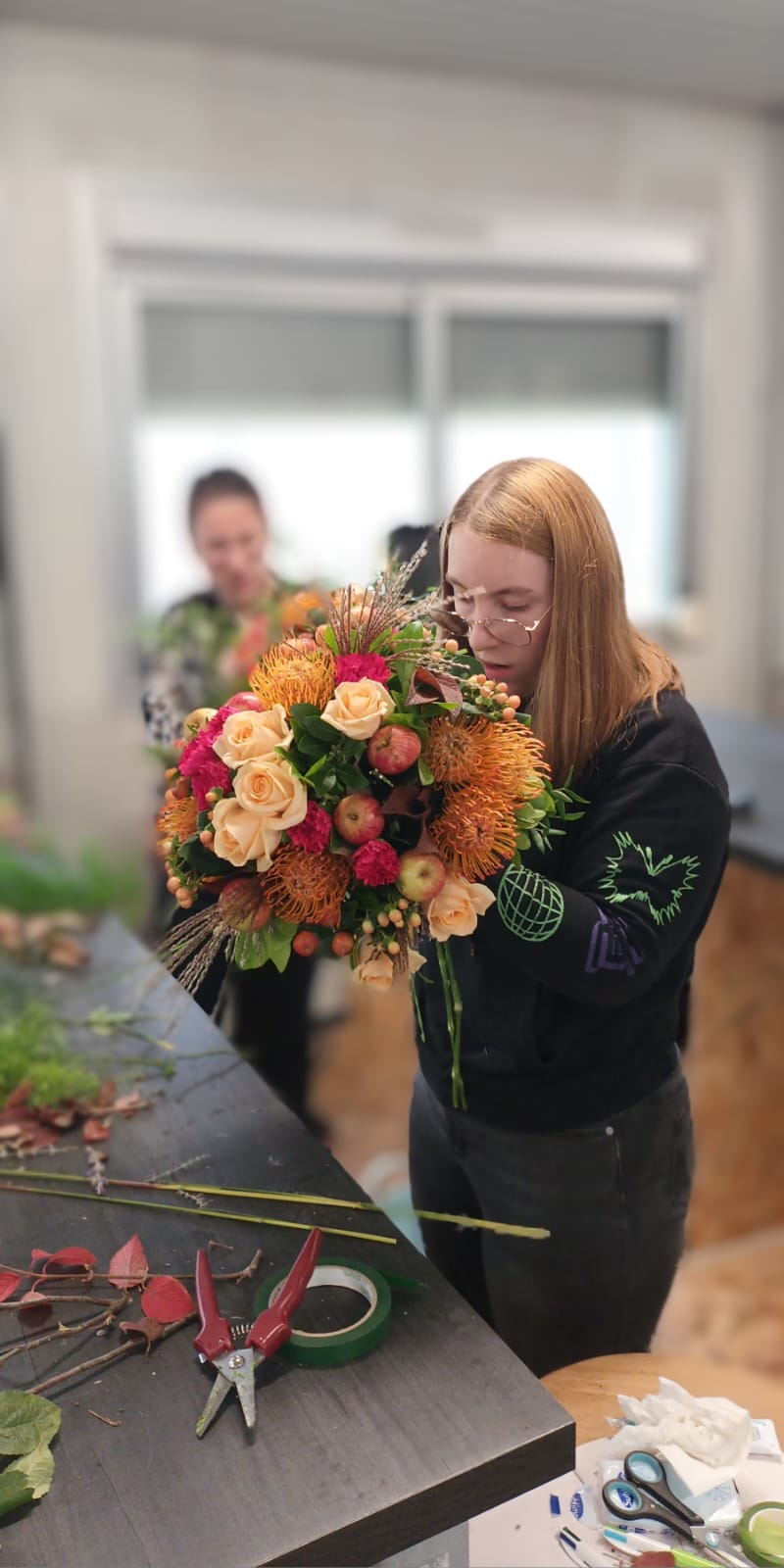 Réalisation de bouquets liés ronds de style décoratif, asymétrique par masse avec les apprentis en CAP Fleuriste 2ᵉ année et en un an.