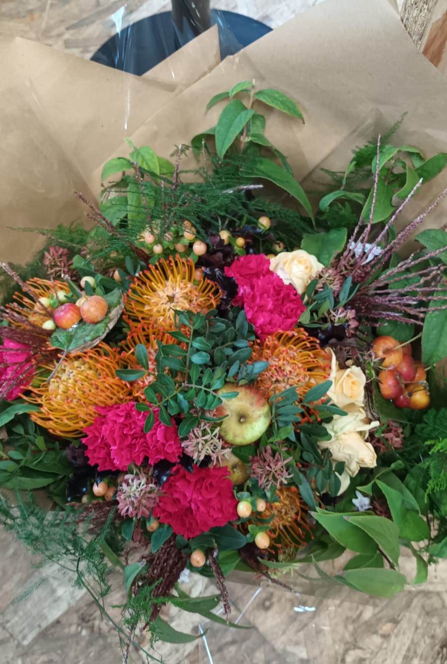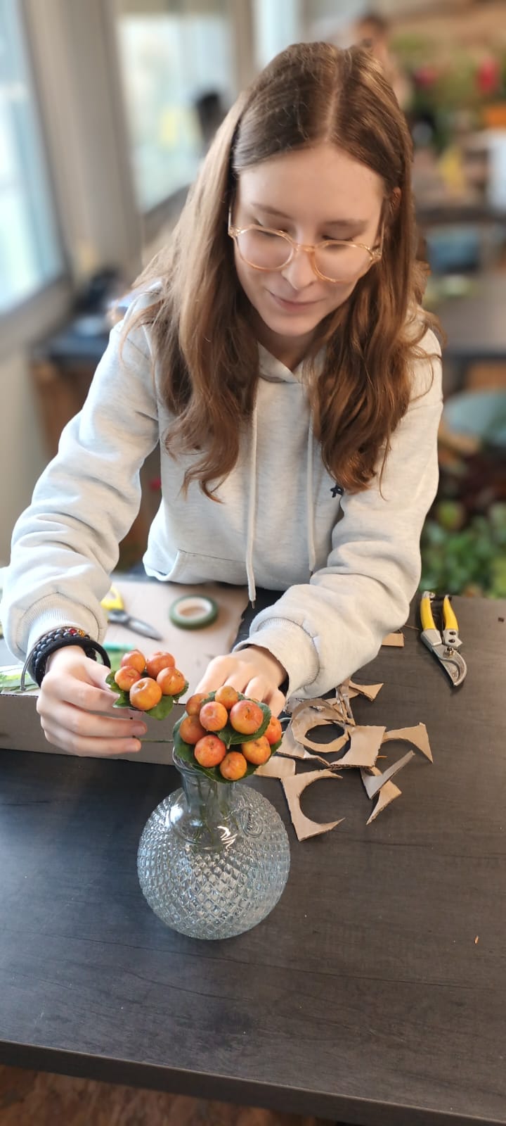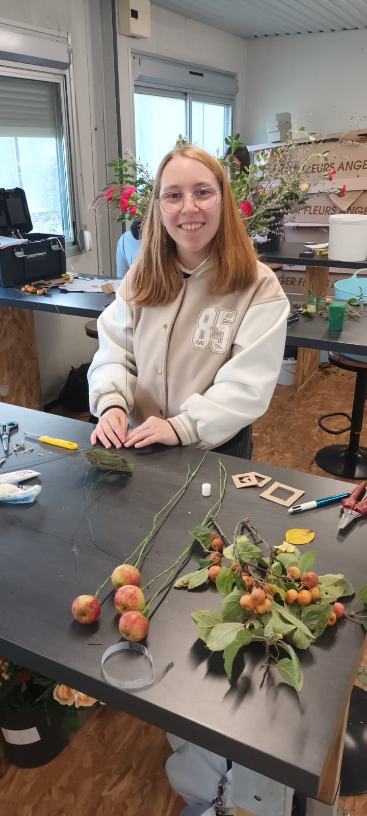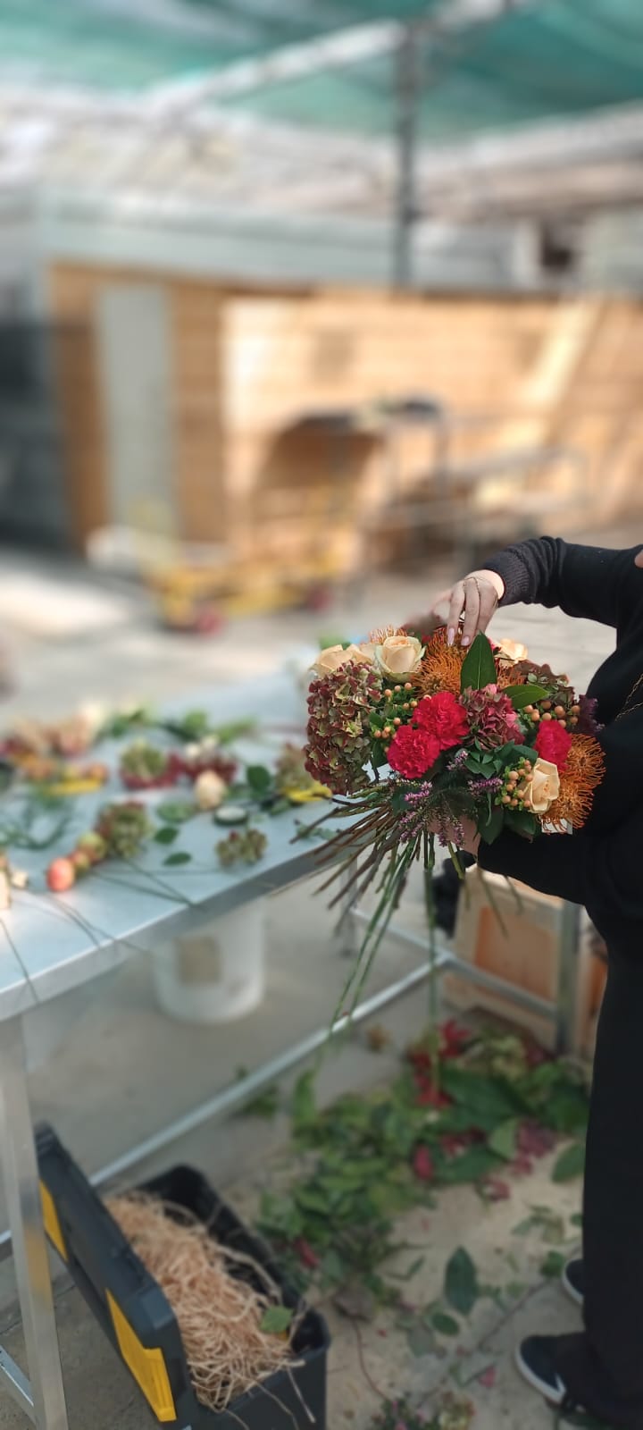 Réalisation de bouquets liés ronds de style décoratif, asymétrique par masse avec les apprentis en CAP Fleuriste 2ᵉ année et en un an.